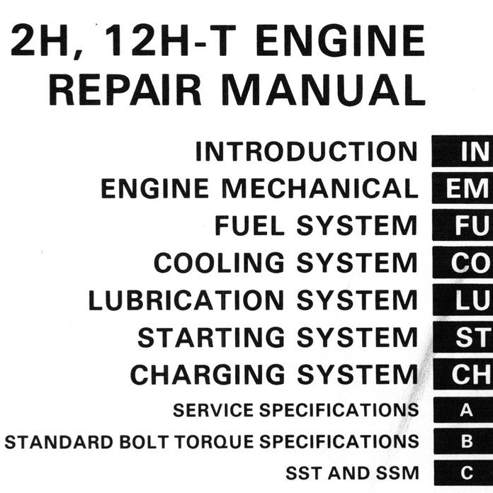 COVERAGE OF THIS MANUAL: 2H / 12H-T ENGINES. The 2H is a 4.0 L (3980 cc) inline 6, 12 valve OHV diesel engine. Bore is 91 mm and stroke is 102 mm, with a compression ratio of 20.7:1.